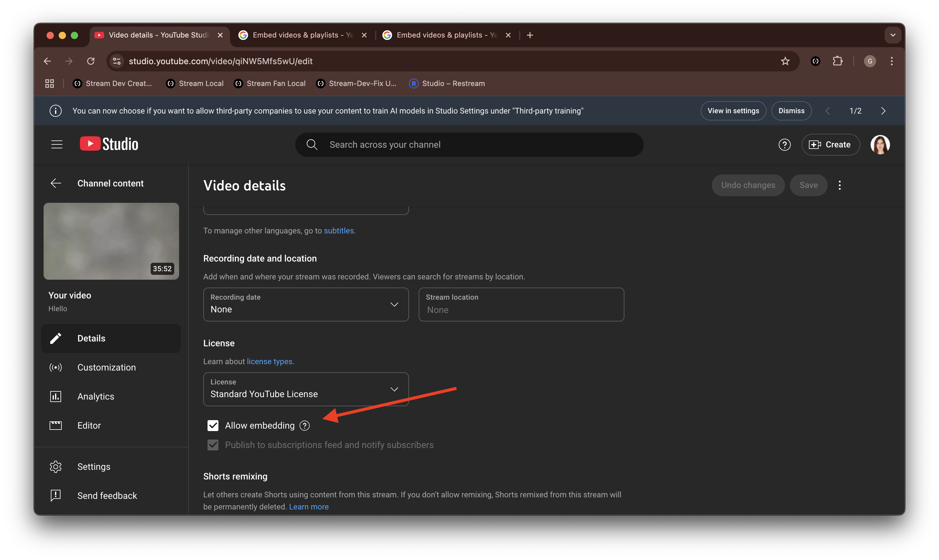 Please note that all historically uploaded videos will need to have this video setting adjusted individually. For future uploads, it will reference the latest change and have embedding allowed by default